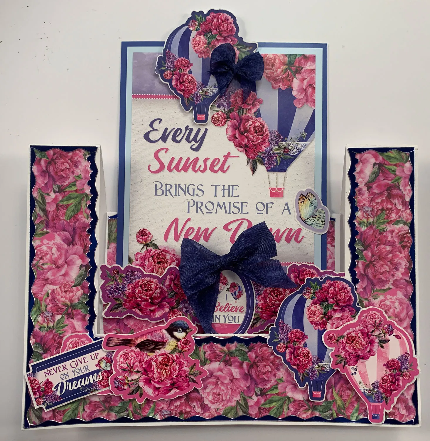 Cut out peony Parchment using the large parchment pattern and glue the Parchment to the card base leaving 1/8” white border. Glue stick worked very well to attach the parchment. Outline with Border Dazzles™. Cut out two rectangle parchment patterns and cut them out of peony parchment then glue each to a step. Add Border Dazzles™ to the top of the top step section.