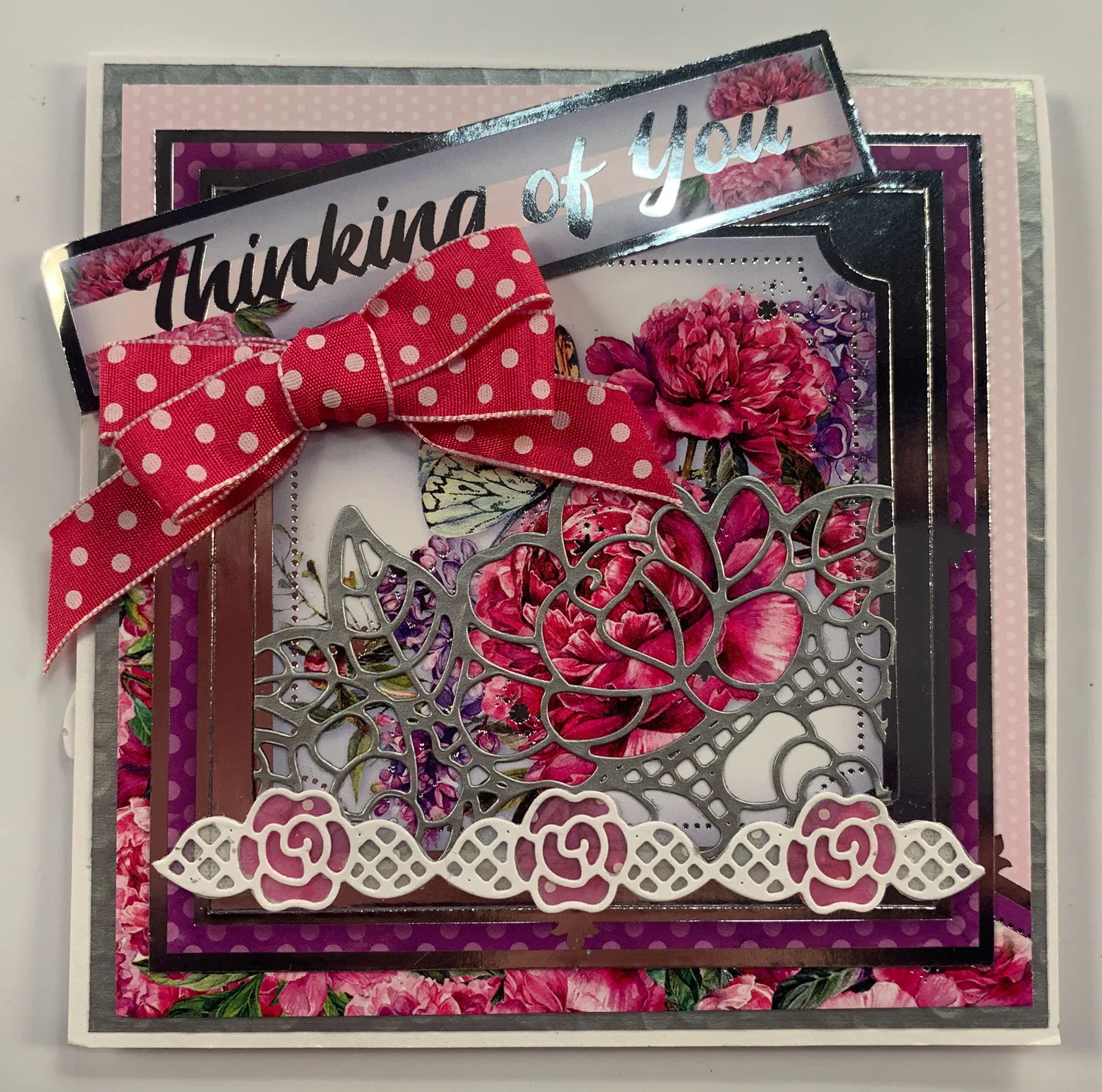 Cut the white card to 5”x5”. Remove the roses/butterfly die cuts keeping all three sections together. Glue just the two outer frames onto the corresponding Adorble Scorable leaving 1/8” borders. Mat again on Hammered Silver with 1/16” borders. Glue to the card front leaving a white card border. Die cut the rose from Hammered Silver. Place on the Sticky Specks sheet, press and lift off the die cut piece. Position over the roses topper image and trim a bit then wrap the edges behind the image. Foam tape to the center of the card.