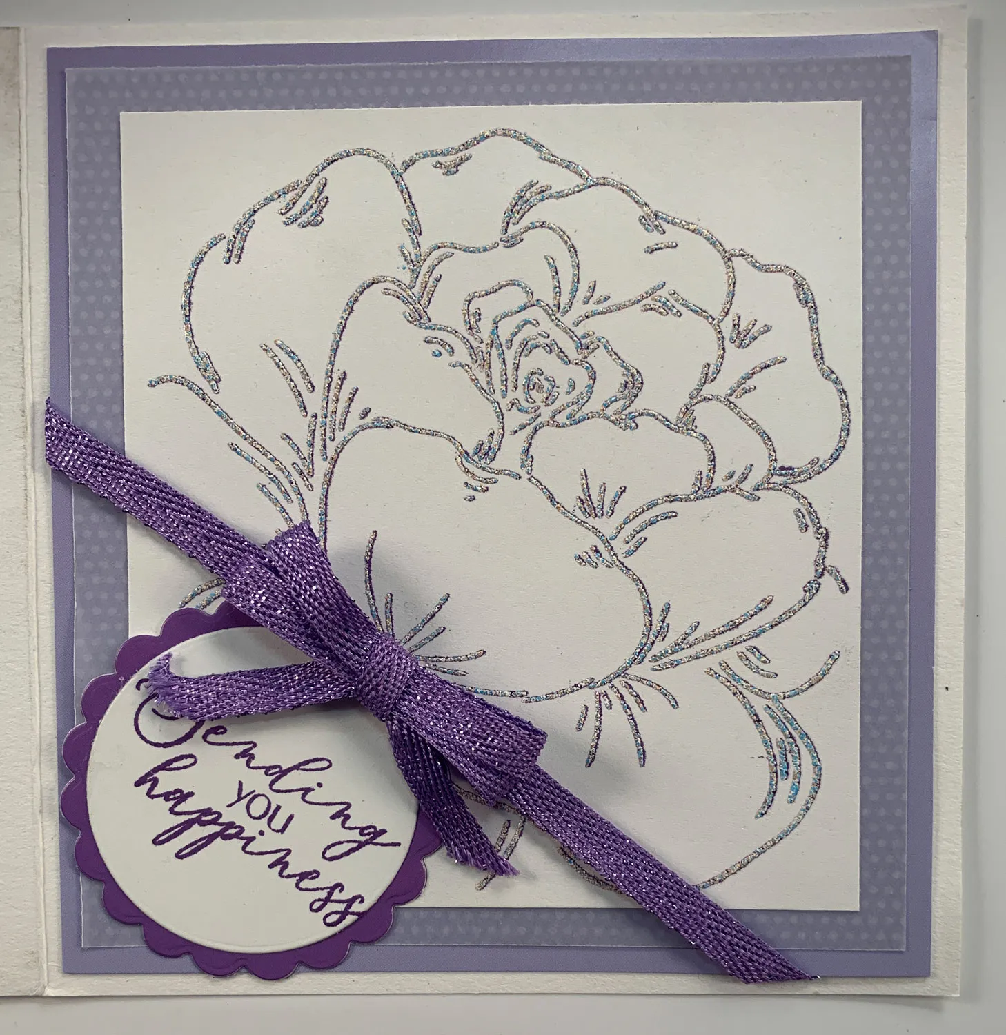 Cut the white card to 5”x5”. Stamp the flower on white Adorable Scorable using the VersaMark ink pad. Pour on Hydrangea Embossing Powder, pour off the excess and melt the powder with a heat gun. Cut to 4”x4.25”. Mat on lavender dot Parchment leaving a 1/4” border. Mat again on lavender Adorable Scorable with 1/8” border. Use the cutting dies to cut a circle and scallop in white and purple Adorable Scorable. Stamp sentiment with Damson Wine ink pad and glue together. Wrap purple ribbon as shown and glue the whole piece to the card front. Zot™ a bow on top.