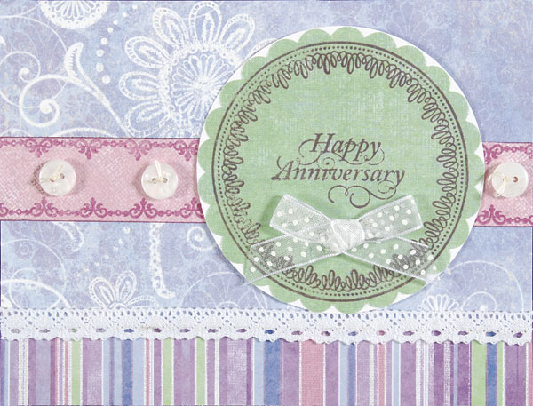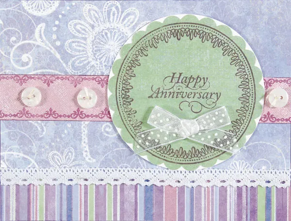 Stamp the large circle border onto green paper with “Happy Anniversary” at the center. Punch out using the scallop circle. Mat with a white circle punch and foam tape to the right side of the border. Zot™ a sheer white dot bow under the greeting. Thread 3 buttons with thread and glue to the border, as shown.