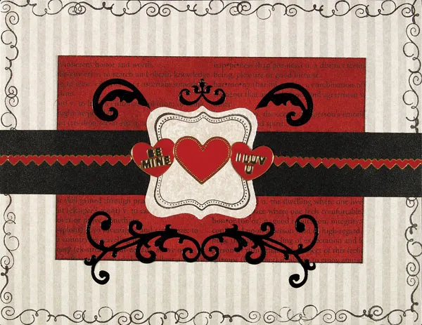 Stamp a Fancy square onto tan paper with a black image. Punch with the Fancy square and glue to the card center. Glue a red heart border across each side of the black border with 3 red hearts at the center of the square. Place flourishes at the top and bottom of the punched square.