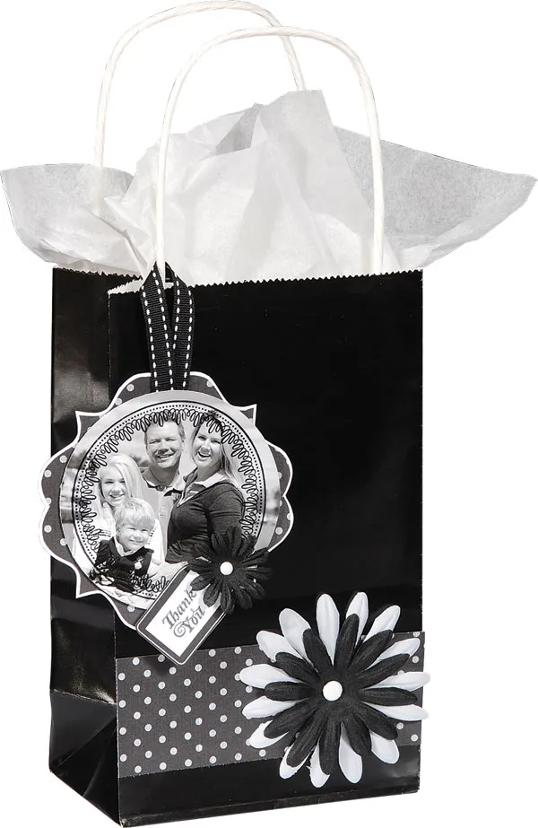 Bag: Cut a 5”x1 ¾” strip of black dot paper and secure layered lowers to the right side, using a white brad. Glue near the bottom edge of the bag.