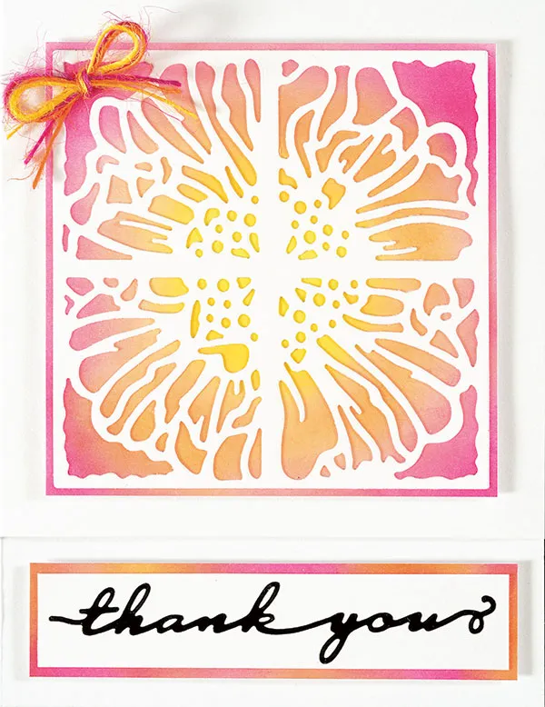 Die-cut two botanical frame die-cuts from white cardstock, and save one for the inside. Set one die-cut on the center of 5”x5” white cardstock and lightly trace around the outer edges of the die-cut. Remove the die-cut and use the daubers to apply yellow ink to the center of the cardstock piece. Apply a ring of orange, next, blending the two colors, then pink, continuing to the outer edges of the cardstock. Glue the die-cut centered over the inked cardstock and cut the cardstock to mat with a 1/16” border. Foam tape the piece centered on the front panel of your cutaway card. Using yellow, pink and orange twine, hold the twine together and tie a small bow. Zot™ on, as shown.