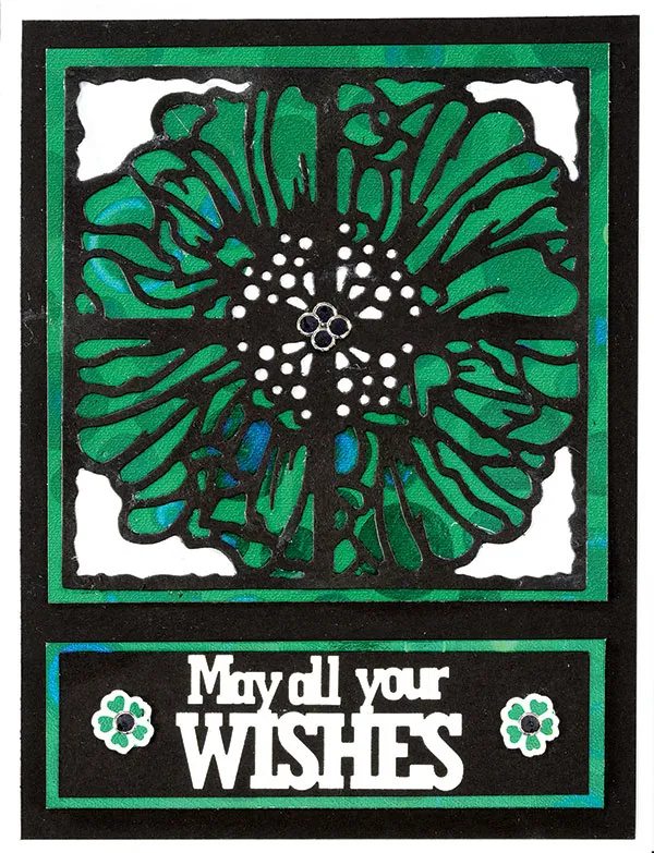 Place “May all your WISHES” white Inside/Outside Greetings Dazzles™ 4”x1 1/8” black cardstock. Back 2 white flower Dazzles™ with green holographic paper and glue to each end of the rectangle. Place medium Black Jewel Border Dazzles™ on the flower centers. Foam tape green holographic paper to the back, leaving 1/8” borders and glue to the card bottom.