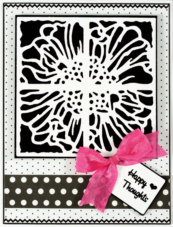 Use the Tiny Tags & Little Labels Template to trace a “Squared Tag A” and “Bracket Label F” onto white cardstock. Remove the template and cut out the shapes. Mat the tag on black cardstock with thin borders. Glue it angled near the lower right corner of the card and place Dazzles™ “Happy Thoughts” and heart on the center as shown. Use 3/4" wide bright pink crepe ribbon to tie a bow. Trim each tail into a “V” and Zot™ on the tag as shown.