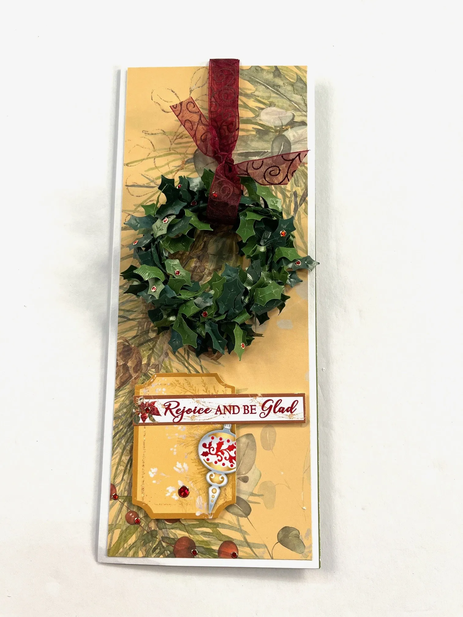 Cut 3 1/8”x8 1/4” gold Sparkling Season 12x12 Patterned Cardstock and tape to card front leaving 1/8” white borders all around. Make the wreath by wrapping two loops of craft wire together. Wrap a 4” loop of burgundy ribbon around the wreath. Attach over the top and onto the backside. Place Zots™️ behind the ribbon in the front. Tie a burgundy knot at the top of the wreath. Place red Jewel Dazzles™️ onto the wreath holly leaves. Foam tape die-cut below wreath and layer “Rejoice and Be Glad” on top. Place red Jewel Dazzles™️ as shown.