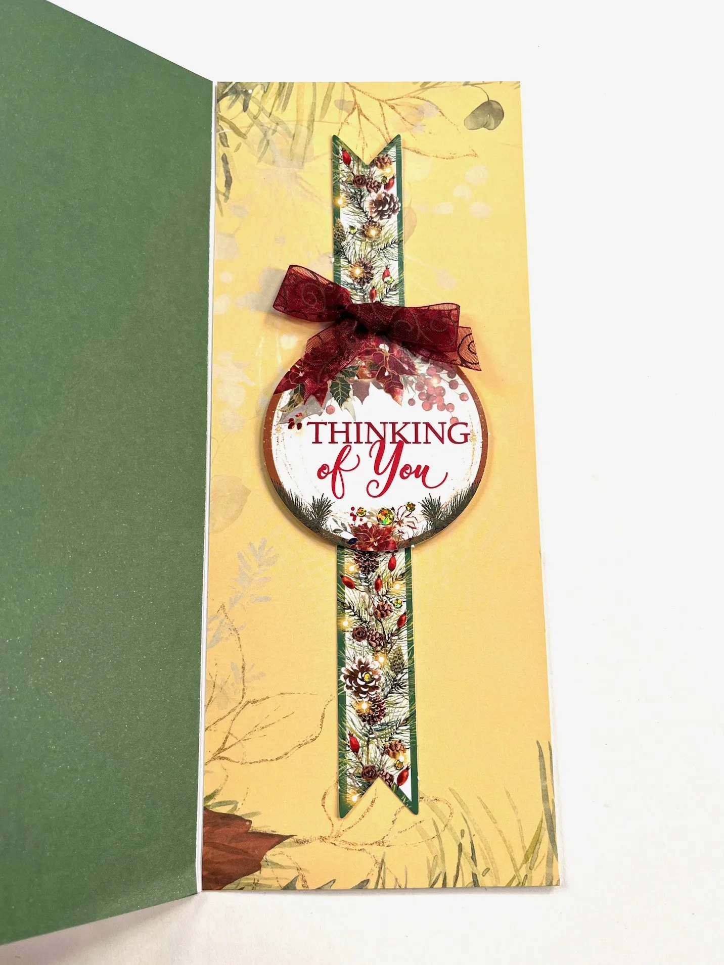 Card inside: Cut and tape 3 1/8”x8 1/4” green Sparkling Season 12x12 Solic Cardstock to the left side of the card. From the same cardstock on the front cut 3 1/8”x 8 1/4” and tape on the left side. Tape a green die-cut in the center and then foam tape “Thinking of You” die-cut to the center of the border. Make and Zot™️ a 2” wide bow from the Burgundy Ribbon Set and place above sentiment die-cut.