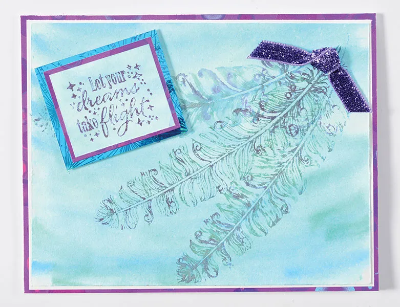 Color directly on the feather stamp with the green Wink of Luna. Color over highlights with the Blue and Violet Wink of Luna. Spritz the stamp with water. Stamp on the painted paper. Spritz the stamp again (without re-inking), and stamp again. Spritz again, and stamp a third time. Let dry, and wash the stamp. Mat on white cardstock with 1/16” borders. Glue to the card front.
