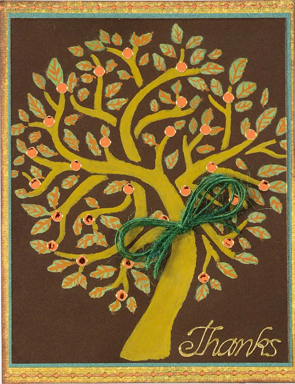 Tape the stencil to a 6”x6” brown cardstock. Use the gold Wink of Luna to color the trunk and branches of the tree. Use the light green Wink of Luna to color the leaves. Use the copper to draw the veins of the leaves. Let dry. Cut to 4 ¾”x5 7/8”. Mat on green glimmer paper with 1/16” borders. Glue to the card front. Place the Dazzles™ as shown. Make a four loop bow from green twine, and zot on the tree.