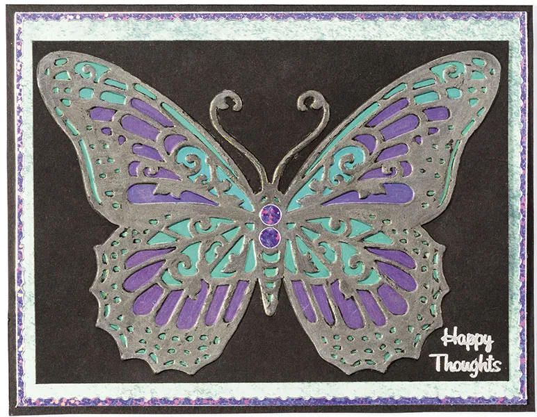 Place a 5”x6” black cardstock in the embossing folder, and run it through the die cutting machine. Color the entire butterfly with black Wink of Luna. Let dry. Go back over the recessed areas with violet and dark green Wink of Luna. Cut to 5¾”x4¼&rdquo,; and glue centered. Place Dazzles™ as shown.