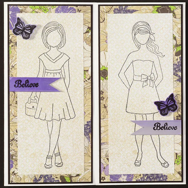 Front panels: Use StazOn® ink to stamp the two front panel dolls onto 2 ¼”x5 ½” light tan papers, as shown. Mat each on floral paper with ¼” borders, then on black cardstock with 1/16” borders. Glue onto the front panels. Swipe the top of a 3”x2” silky paper with the purple Luna marker and the bottom with the silver marker, then let dry. Stamp “Believe” at the top and bottom with VersaMark&trade,; dust with embossing powder and set with the heat gun. Cut into separate banners, as shown, and foam tape in place. Repeat the process to make four butterflies, cut out each and foam tape two onto the front panels.