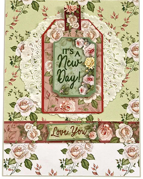 LeNae covered her 5”x6 ½” card with green roses Perfect Little Prints 12”x12” Patterned Cardstock then glued 5”x1 ½” white roses Patterned at the bottom. She glued a 4” Paper Doily at the top and glued the border and tag Perfect Little Prints Die-Cuts as shown. “It’s A New Day” and “Love You” Die-Cuts were foam taped in place and a small floral Die-Cut was folded in half and glued at the top.
