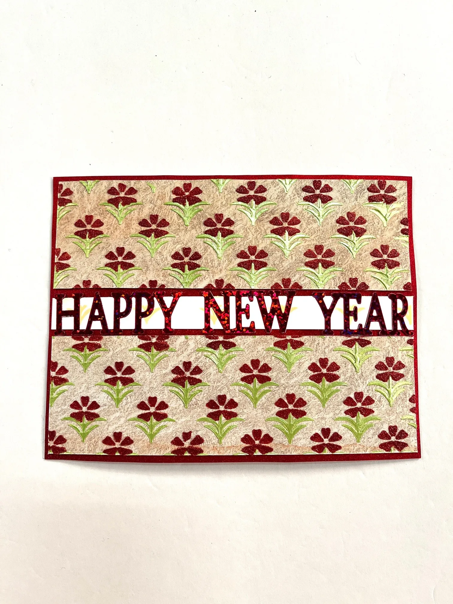 Cut an 8” square of Mystic Floral Tan paper. Line Stencil “C” in the left corner of the paper. Tape in place and use the palette knife to cover all the flowers with the red glitter paste. Wash Stencil and let dry. When dry, move the same stencil to the right, and match the last flowers with the first flowers on the stencil. Use the palette knife and the red glitter paste to cover all the flowers again. This will give you a long paper with red glitter Flowers. Wash the stencil and let dry.