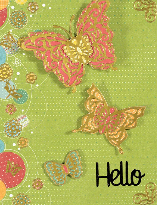 Foam tape the butterfly bodies only, leaving the wings free. Place as shown. Place the corner Dazzles™ on the top and bottom right corners. Place the small flower, butterfly, and dragonfly Dazzles™ along the border, scattering them on the circles. Place the “Hello” Dazzles™ on the bottom right corner.