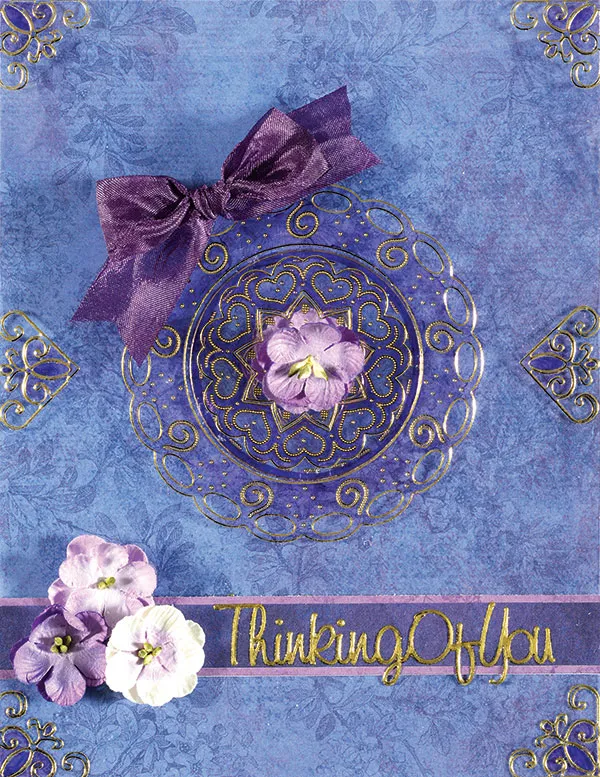 Zot™ lavender Forget-Me-Nots as shown. Use 3/4” wide purple crepe ribbon to tie a bow. Trim the ends into a “V” and Zot™ on the edge of the Dazzles™ frame as shown. Place Greetings Dazzles™ “Thinking Of You” on the right side of the blue/purple matted strip.