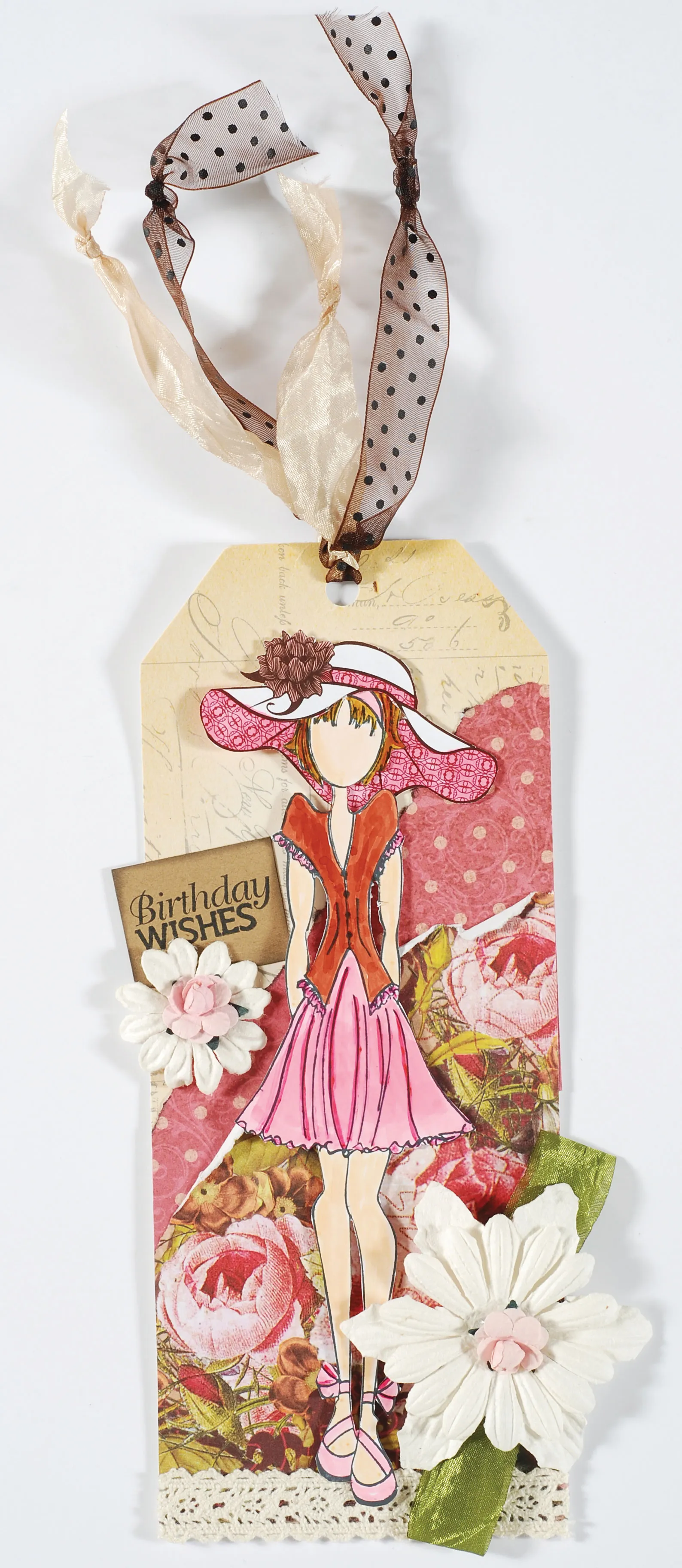 Stamp the Doll #8 image onto Silky Papers and color flesh with Spectrum Noir Pens Pale Hues FS2 and PP1. Color shoes, skirt and trim Pinks PP5. Color top and hair with Browns TN7. Down load and print a floppy hat on Silky Papers. Color the hat trim with Pinks PP5. Use the X-®acto knife to make a slit in the hat crown and slip onto the doll head. Foam tape the doll to the tag as shown.