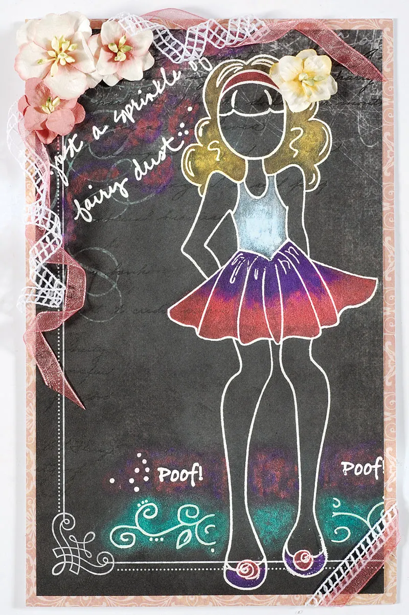 Use VersaMark™ to stamp the Doll on the right side of a 4 3/4”x7 3/4” Chalkboard black border paper (keeping the corner border artwork on the lower left corner), dust with white embossing powder and heat emboss with the heat gun. Stamp and emboss the “just a sprinkle of” portion of the border stamp at an angle on the upper left corner of your piece(mask of the rest of the stamp), then mask, stamp and emboss the “fairy dust” portion of the stamp below it in the same manner. Use the same method to stamp and emboss the “Poof!…” and vine border stamps along the bottom, as shown.