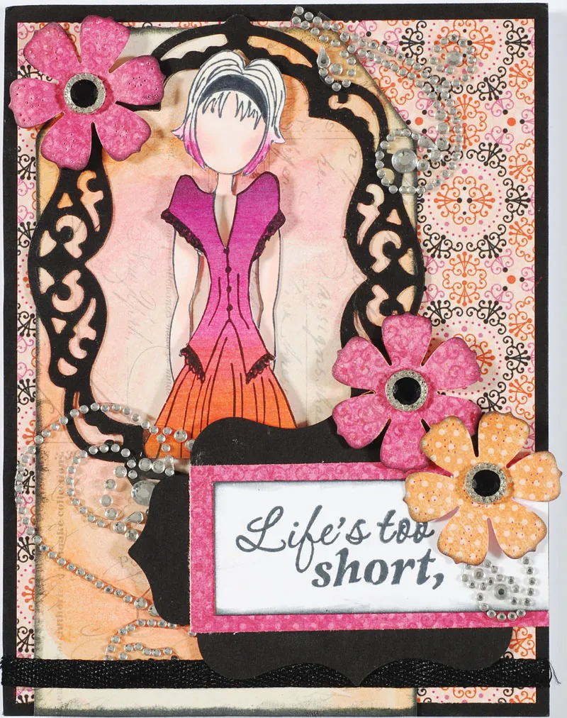 Glue lacy frame around the doll. Cut and place Rhinestone Allure Swirl as shown. Zot Grapefruit black glimmer ribbon horizontally ¼” from bottom. Glue inside of lacy frame horizontally to bottom right corner of card ¼” from bottom. Cut 3”x1¼” white cardstock and stamp Smart and Sassy Sayings “Life’s too Short,” stamp onto the left side of the cardstock. Mat onto Grapefruit pink patterned paper leaving a 1/8” border. Glue even with the right side, and ¾” from the bottom. Zot™ pink and orange flowers as shown.