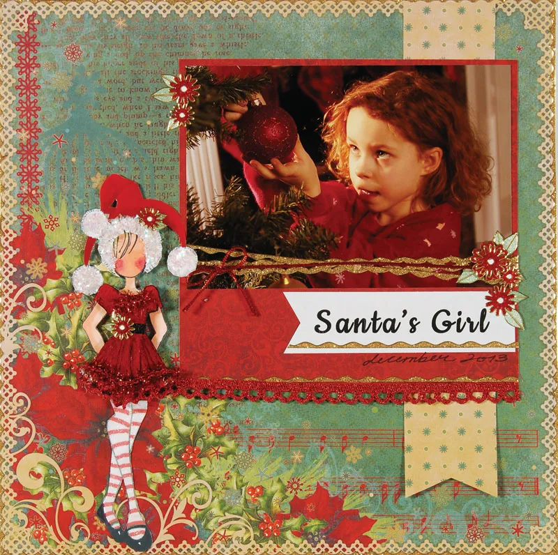 Stamp the doll onto Peacock Red Specialty paper and cut out the dress. Stamp and cut out the belt from black cardstock and glue to the dress. Zot™ Red Fancy Trim lace and tinsel to the bottom of the dress. Zot™ tinsel to the collar of the dress. Foam tape the dress to the cut out doll. Cut out digital Santa Hat, and add Crystal Lacquer to white areas of the hat. Sprinkle with White Encrusted Jewels Shaved Ice Fragments and let dry. Glue to the doll’s head. Then glue the doll to the page 1¾” from the left and even with the bottom edge. Place Layered Flower Dazzles as shown.