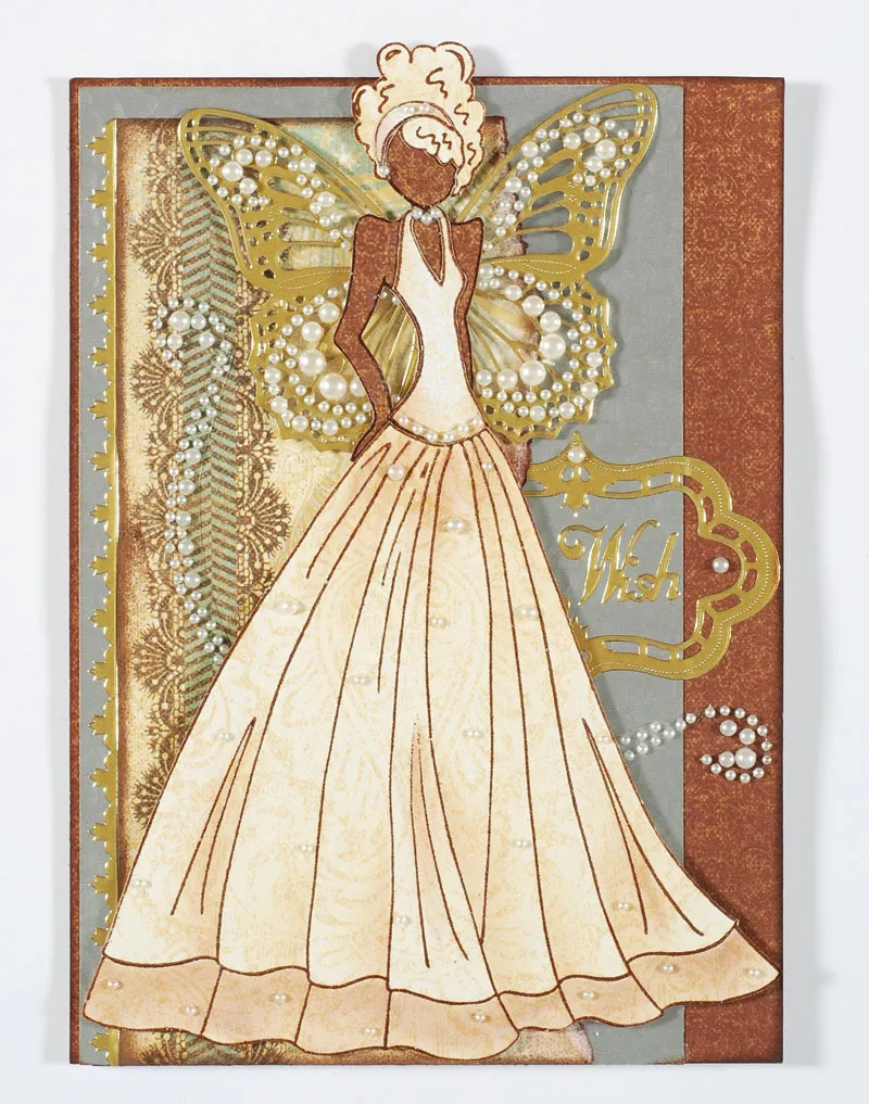 Place the large butterfly Dazzles™ on acetate and trim next to the Dazzles™ edge, then place matching pearl swirls on each wing. Zot™ the doll piece over the wings and foam tape the entire piece onto the prepared base, as shown. Cut out individual pearls and place them on the skirt, along the bodice, on the hairband, and as an earring and necklace. Place two more pearls on the label, as shown.