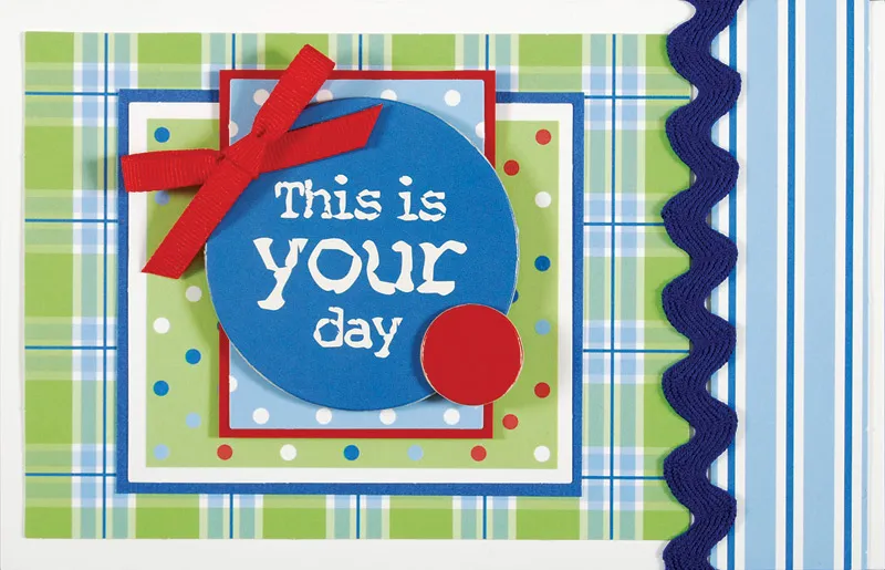 Foam tape the large “This is your day” chipboard circle to the blue dot. Layer a small red chipboard circle to the lower right edge. Zotä a red bow to the top left.