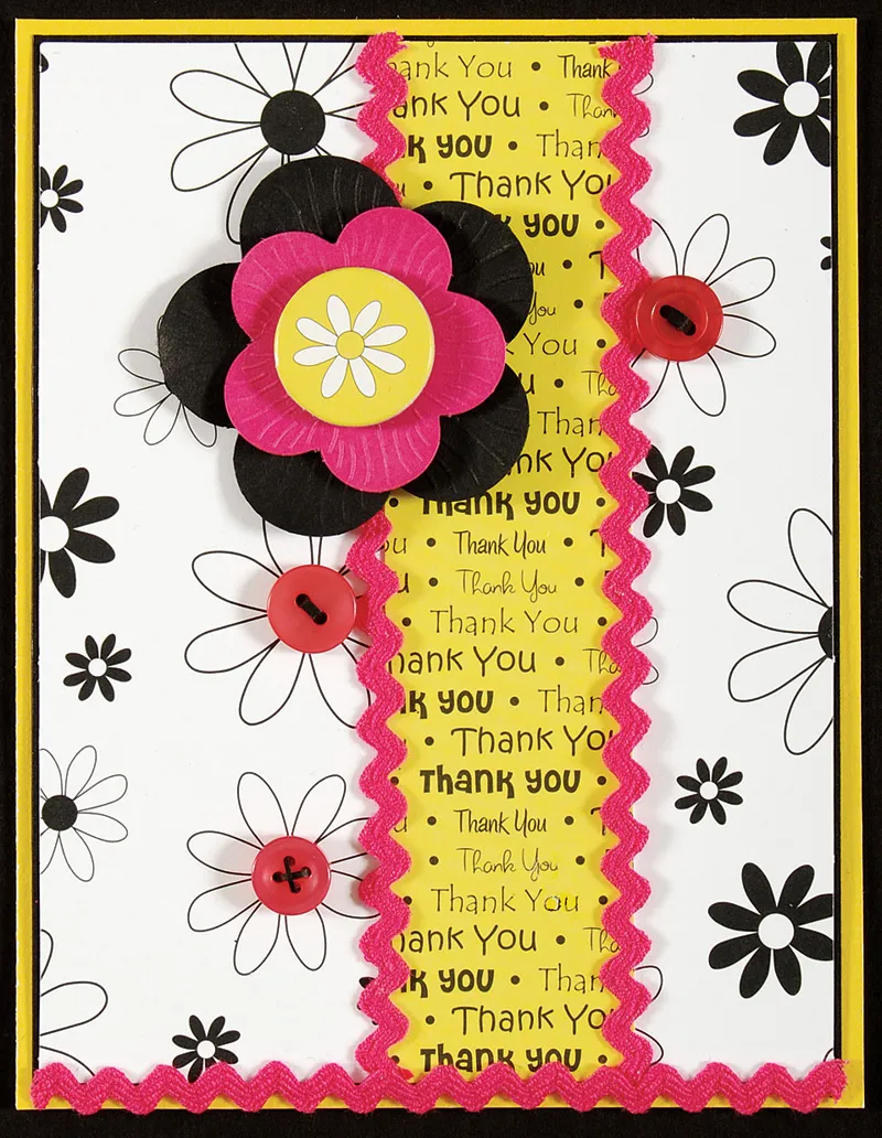 Glue pink rick rack along the edges of the yellow/black “thank you” strip and the bottom edge, trimming ends evenly. Layer 1 black and 1 pink flower together with foam tape and foam tape overlapping the “thank you” strip as shown. Foam tape the yellow daisy chipboard circle centered on the flower.