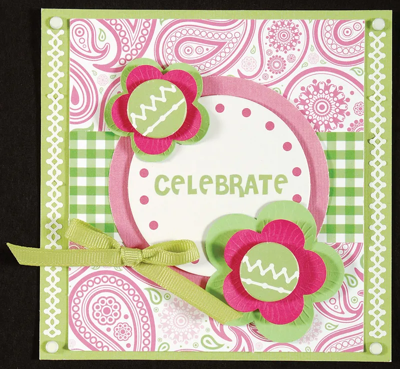 Punch a 3” pink cardstock circle and glue centered over the green/white gingham rectangle. Punch out the “celebrate” chipboard circle and glue centered to the pink circle. Punch out two small green chipboard circles and add White Stitched Border Dazzles™ across the center, trimming edges evenly. Layer green and pink flowers together with foam tape, then foam tape the green chipboard circles centered on the flowers. Foam tape the flowers overlapping “celebrate”. Tie a green bow and Zot™ as shown.