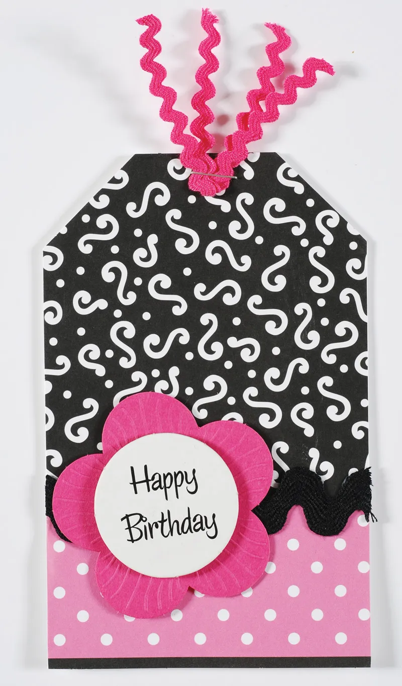 Place the card fold on the side. Glue the black swirl tag shape flush with the fold and top edge of the card front. Glue the pink dot paper below. Trim excess card.