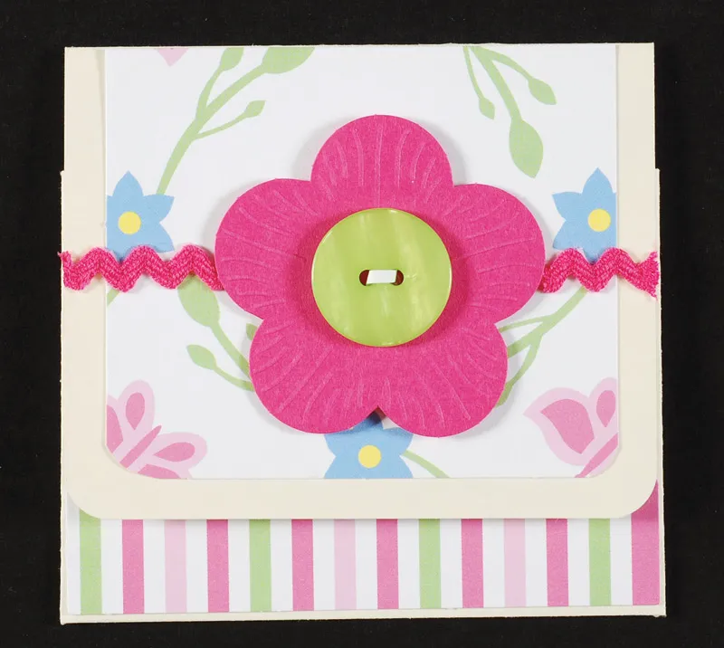 Round 2 corners of the butterfly paper and glue 2 1/2” of the paper to the center of the flap. Glue a length of pink rickrack across the flap. Foam tape a large pink flower to the center. Thread a large green button with a thin strip of white scrap paper, gluing the ends to the back. Glue the button to the center of the flower.