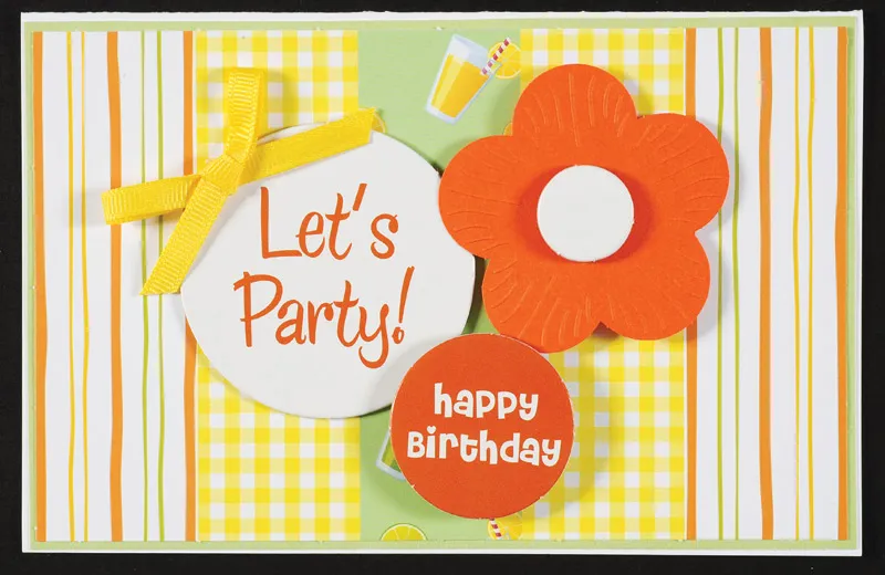 Glue the large white “Let’s Party!” chipboard to the left of center. Zot® a yellow bow to the left side.