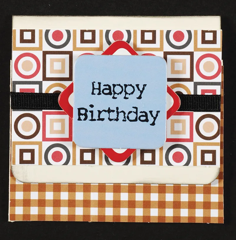 Glue the geometric paper to the front of the flap. Glue a length of black ribbon across the center of the flap. Foam tape the red/white chipboard on point over the center of the ribbon.