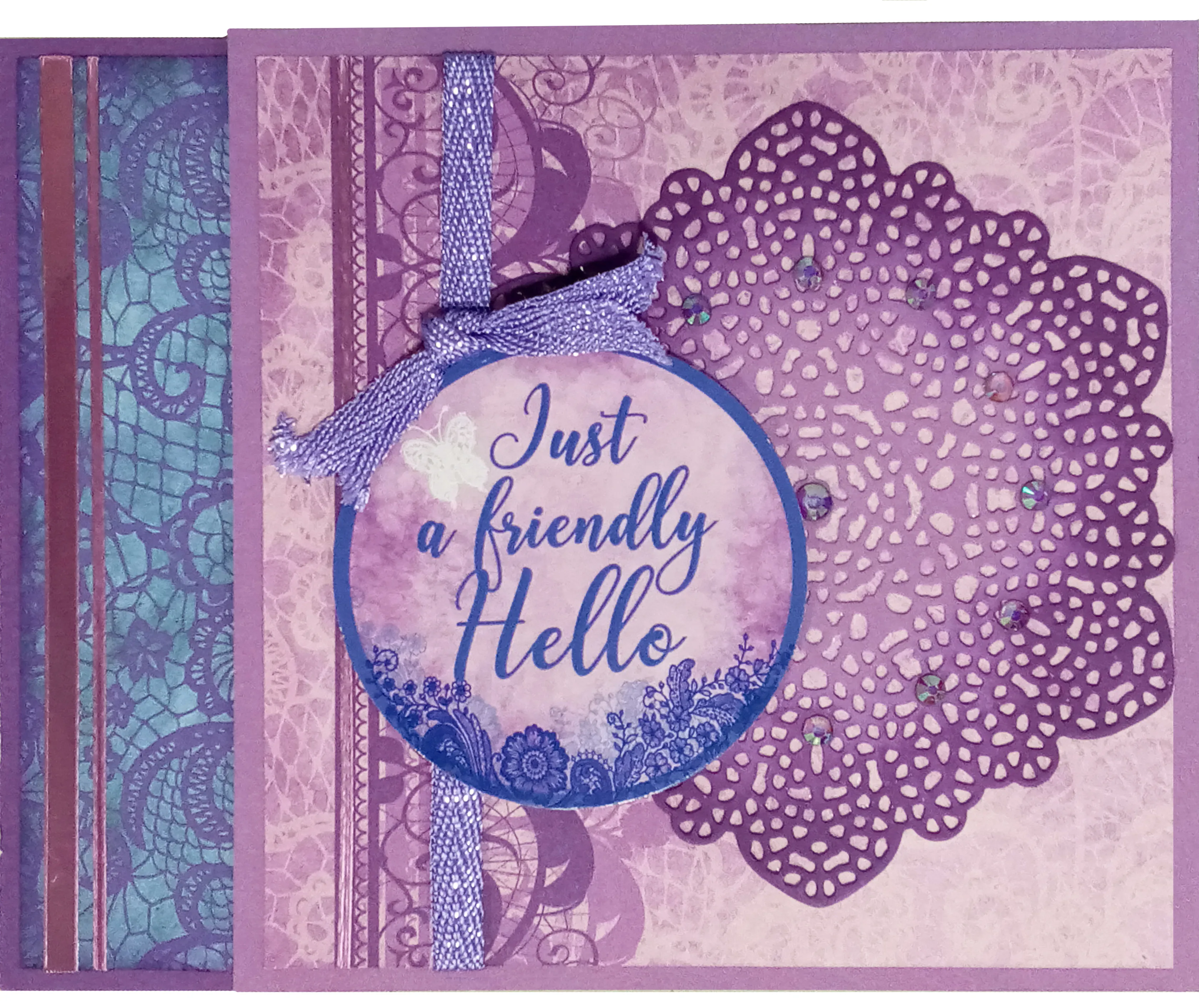 5. Foam tape the “just a friendly hello” die-cut to the front, centered ½" from the left edge. Hold two 4" lengths of lavender glimmer ribbon together and tie a knot in the center. Trim the tails, then glue it to the first ribbon, next to the die-cut. Glue Crystalz on the doily as shown.