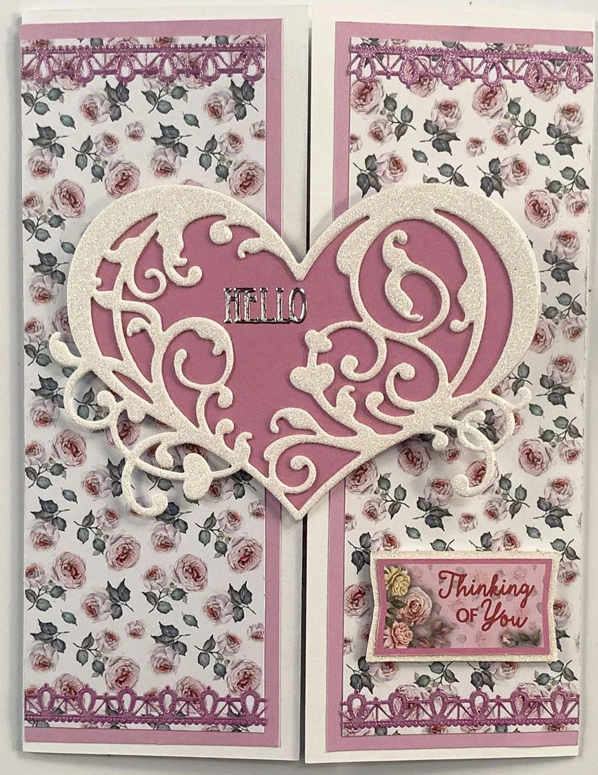 3. Die cut a heart from white glitter cardstock. Trace and cut the heart pattern from pink cardstock, then glue it behind the glitter heart. Foam tape just the left half of the heart to the left front, 1½" from the top.