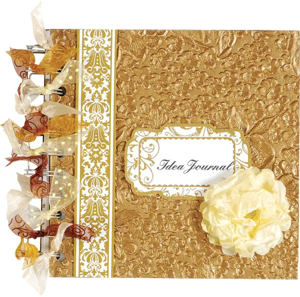 Glue a length of Gold Color Me Border down the front cover, 1/2” from the edge. Tie Heritage cream, gold and brown ribbons to the wire binding.