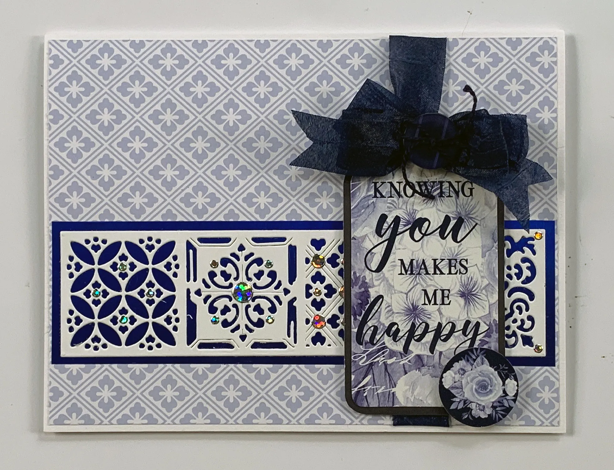 Remove the Blue Persuasion “knowing you…” tag from the sheet and mat it on dark blue Cardstock with 1/16" borders. Foam tape it to the front over the ribbon as shown. Foam tape the small round flower die-cut to the tag at the lower right.