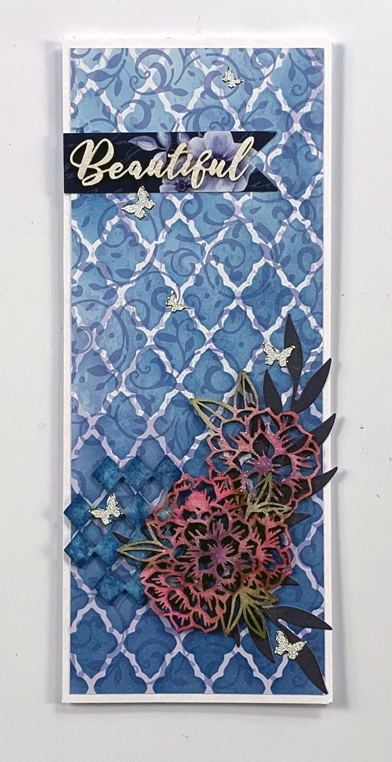 Glue the leaf branches to the front at the lower right as shown. Glue the diamonds near the lower left edge, then glue the flowers, overlapping them as shown. Remove the Blue Persuasion banner die-cut from the sheet and cut 2¾" off one end. Glue it to the front at the upper left, extending inward from the edge. Glue “beautiful” to the banner and place butterfly Dazzles™ as shown.
