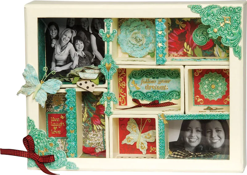 Add photos, paper, the artisan elements, flowers and butterflies to decorate your box as desired. Finish by adding ribbons and gold petite Dazzles™.