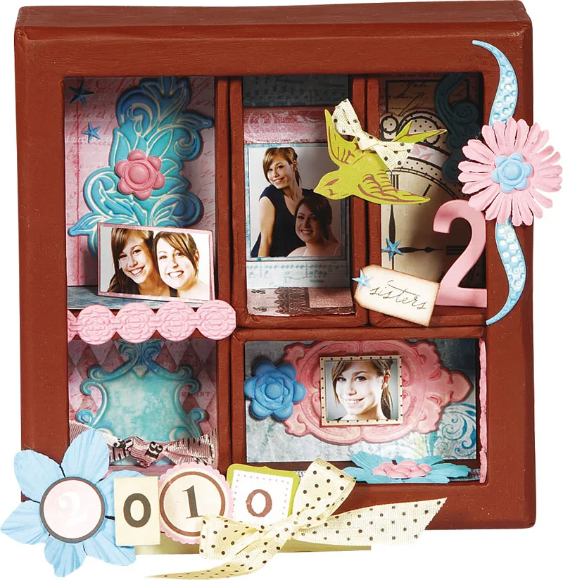 Paint the outside plus inside edges of the box lid, then paint the inside and front edges of the individual boxes and let dry. Cut paper in a variety of colors to fit the inside areas of the boxes as desired, ink edges, and glue in place. Add die cuts or pieces of larger die cuts as shown.