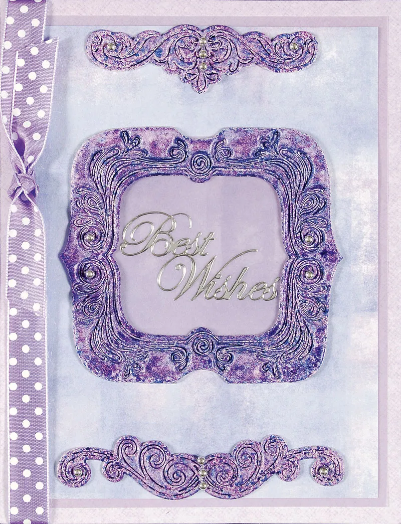 Spritz the frame and swirl pieces with Frosted Grape Smooch, then with Navy Twinkle, and let dry. Place the frame over a 2 1/2” lavender vellum square so the vellum covers the opening of the frame. Place the “Best Wishes” Dazzles™ centered on the opening and attach the frame to the center of the card front.