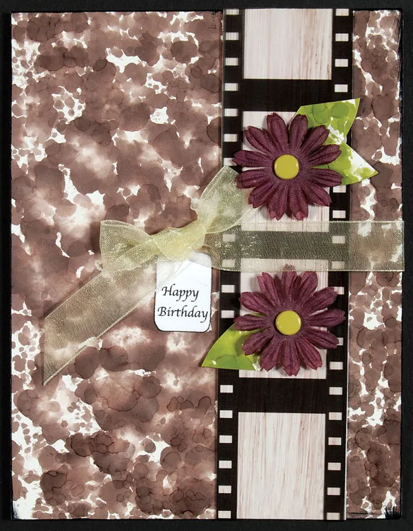 Trim the Espresso inked section to 5"x6 ½" and ink the edges with black ink.Trim strip of gloss paper (plain) and back the filmstrip overlay. Cut out leaves from green inked paper and add flowers and leaves to the filmstrip with brads.