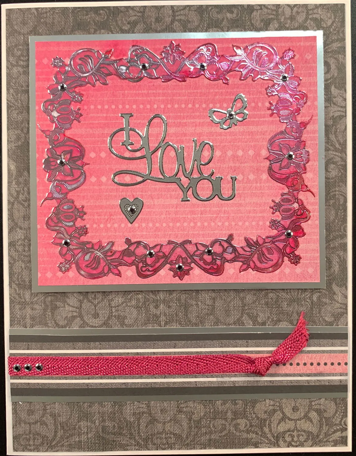 Place silver “I love you” Dazzles™ in the frame center with a silver heart and butterfly Dazzles™ near it as shown. Foam tape the sentiment to the card front, ½" from the card top. Decorate the front with jewel Dazzles™ as shown.
