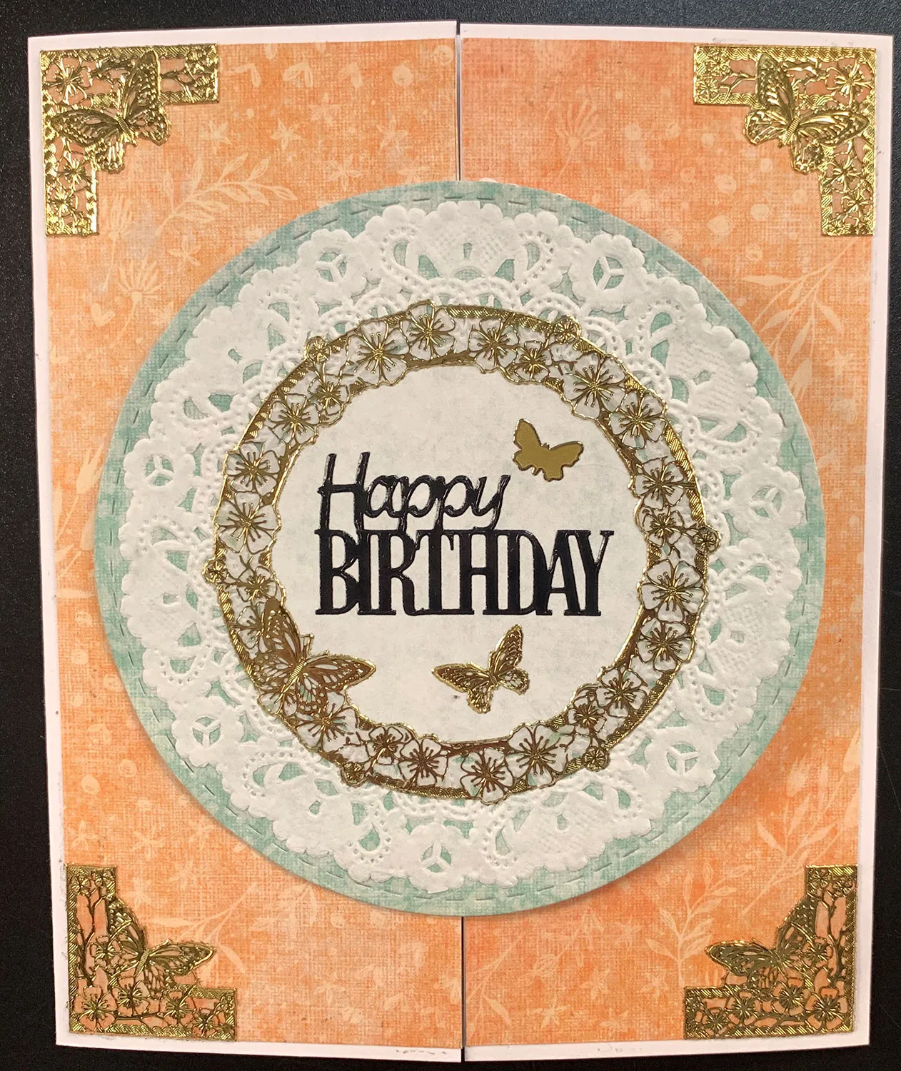 Place the gold circle engraved frame Dazzles™ in the doily center. Place black “Happy Birthday” Dazzles™ in the doily center with a gold butterfly and a gold engraved butterfly Dazzles™ as shown. Place the matching gold corner engraved Dazzles™ in the card front corners as shown. (The right front panel will be finished last.)