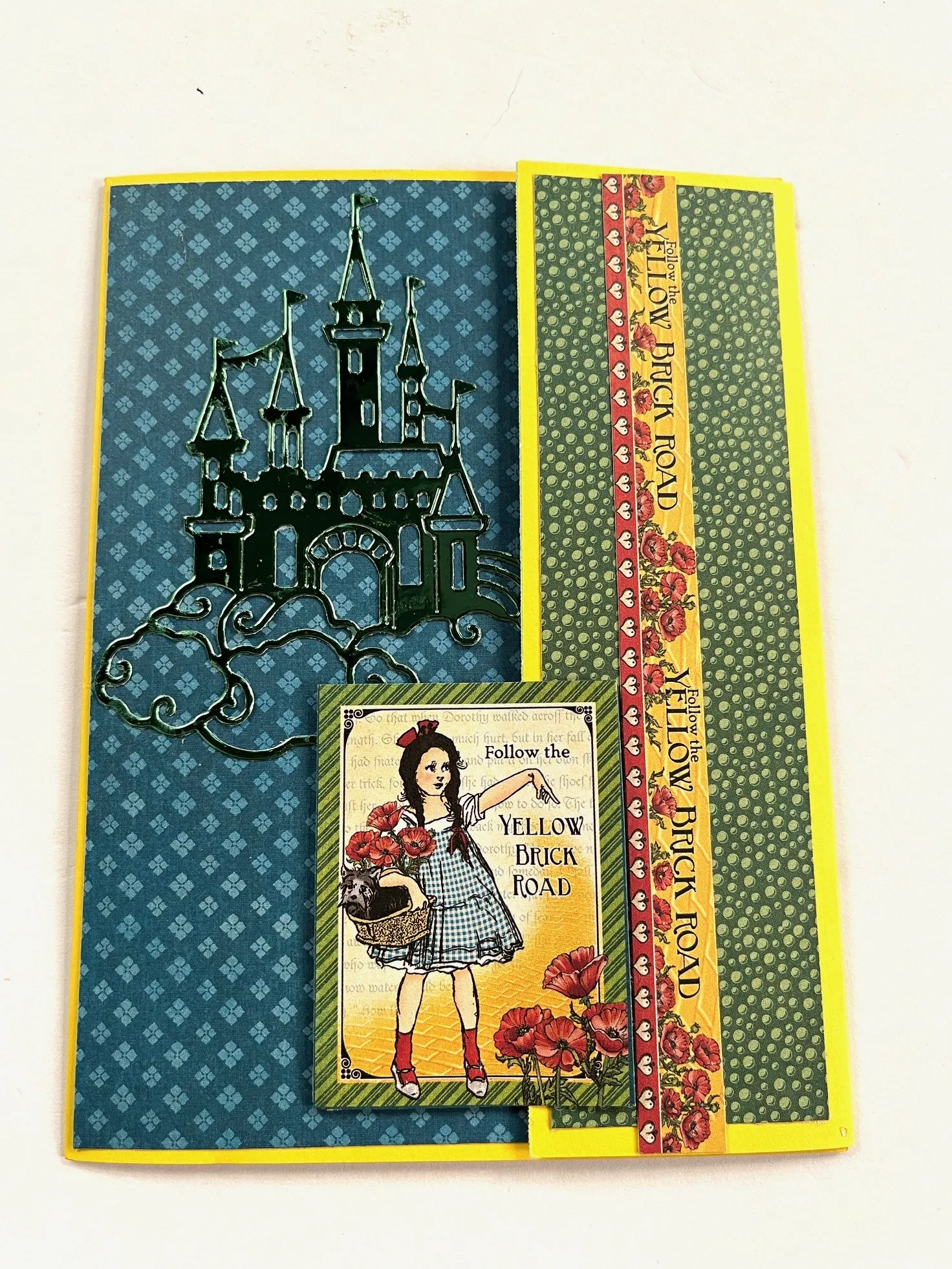 2. Use the castle die with emerald green mirror cardstock and run through the die cutting machine cutting two green castles (one will be used on the inside). Glue to the card front at the upper left side. Cut out the “Follow the yellow brick road” and foam tape so it overlaps the flap.