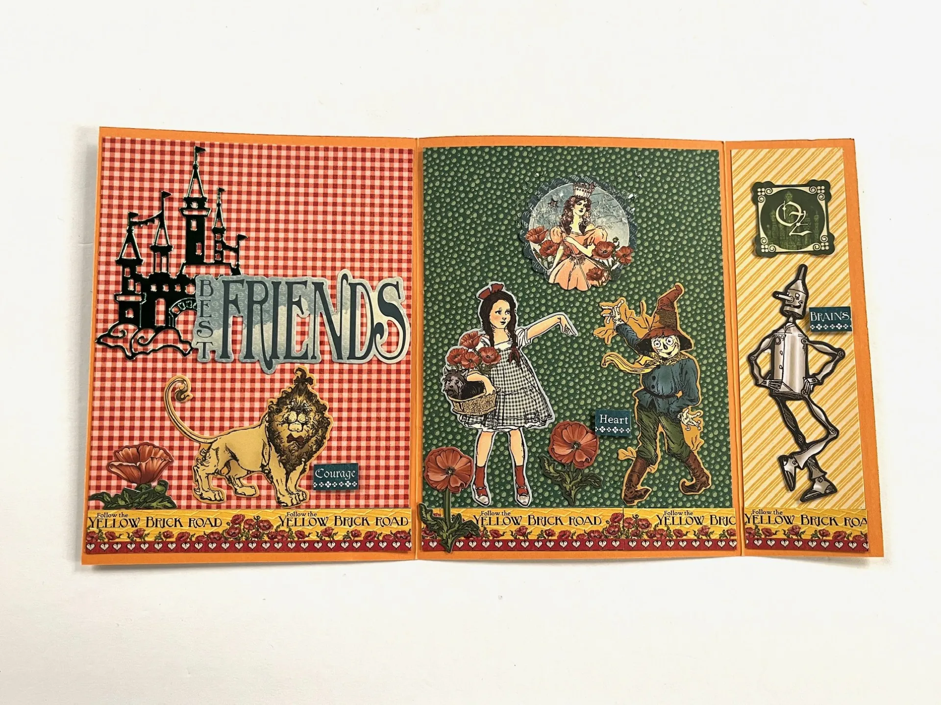 5. Glue the second castle at the upper left side. Glue the lion, scarecrow, tin man, Dorothy, Best Friends, Good Witch circle, poppies, “Oz” die-cuts as shown.