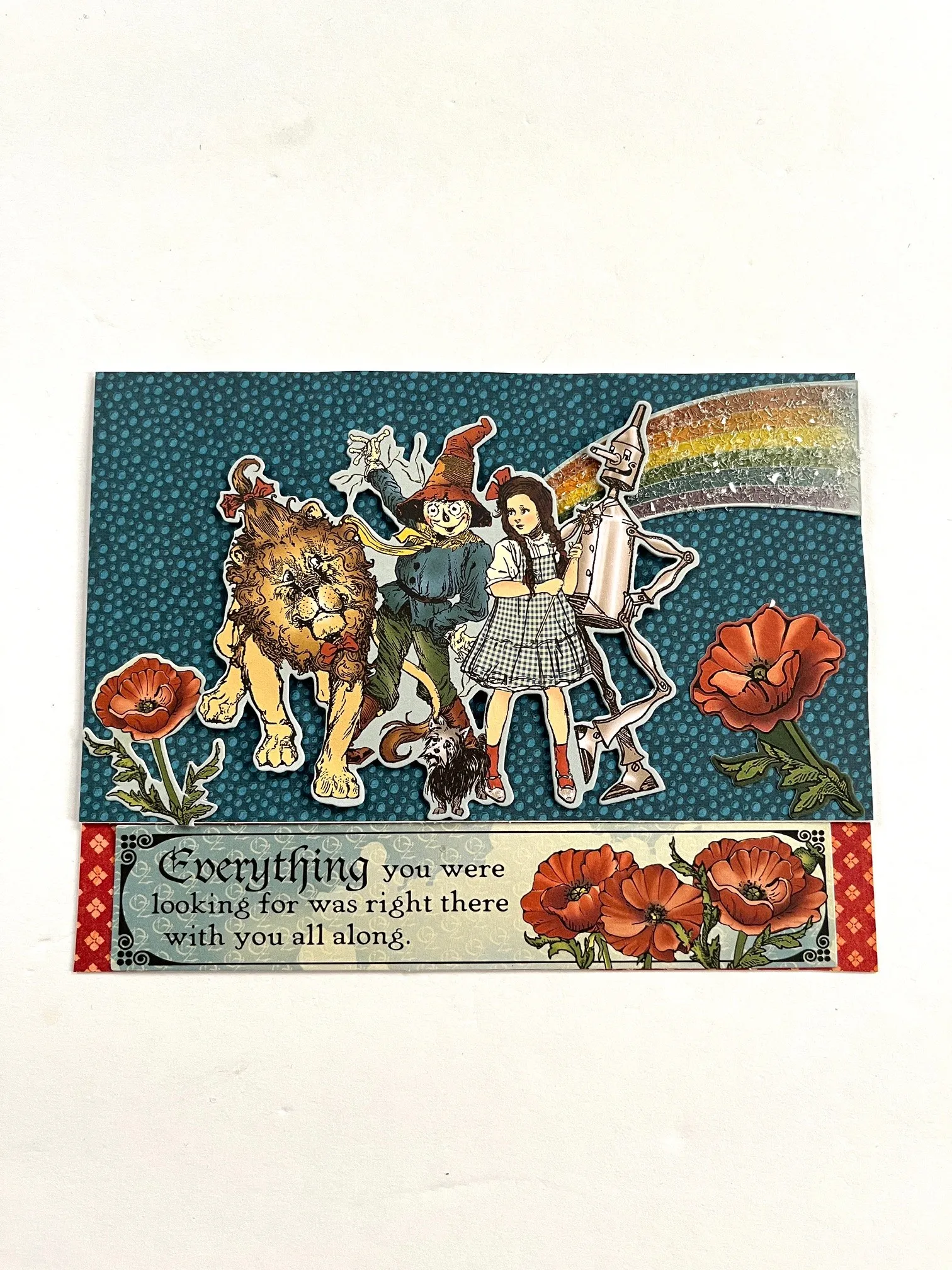 1. Turn the card so the fold is on top. Measure and cut 1 ½” from the bottom of the card top. Cover the card front with blue Wonder of Oz paper. Glue the rainbow and poppies as shown. Spread glue over the rainbow and pour Diamond Dust on top. Tap off the excess and let dry.