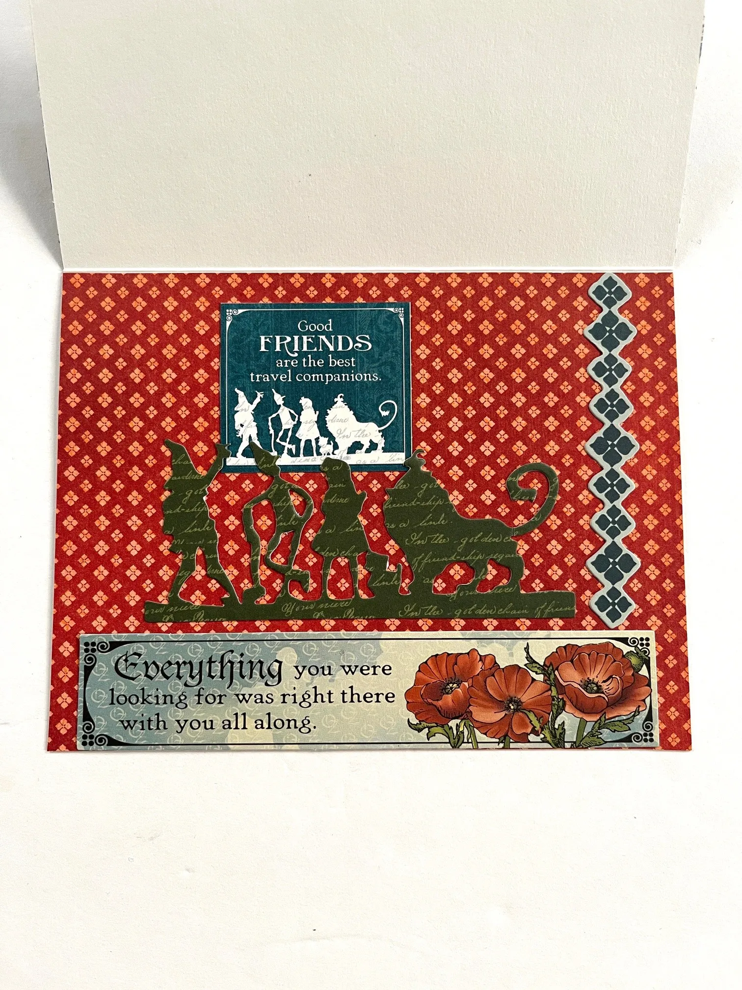 3. Inside: Cover the inside with red/orange paper. Glue the “Everything. . .” cutout along the bottom. Glue the “Good friends” cutout at the top. Glue the shadow die-cut 1/8” above the “Everything” cutout. Glue the blue die-cut at the right.