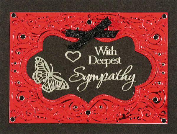 Use the embossing folder, and cutting die machine to emboss a 4¼”x6” red transparent sheet. Use the same method to emboss a 4 1/4”x6” white cardstock. Glue the red transparent sheet over the white cardstock. Trim the edges to 4”x6”. Ink the raised areas with Black ink. Use the X-acto™ knife and pad to cut the center frame out. Save for the inside. Glue the frame to the card front, centered. Place Jewel Dazzles™ and Sympathy Dazzles™ as shown. Zot™ a black metallic bow to the top as shown.