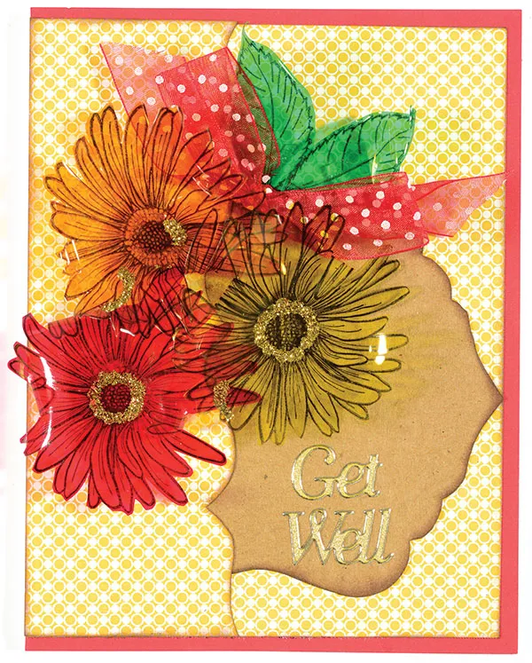 Place Everyday Greetings Dazzles™ silver pearl “Get Well” on the bottom of the Design Took Kit #3 Elegant Label, as shown. Stamp Fresh Cut large daisy onto orange, red and yellow and 2 single leaves on green Color Transparent Sheets using Black StazOn® ink. Cut out each flower and leaf, then heat edges with the heat gun until they curl. Remove from heat and let cool. Zot™ the flowers to the left side of the card as shown.
