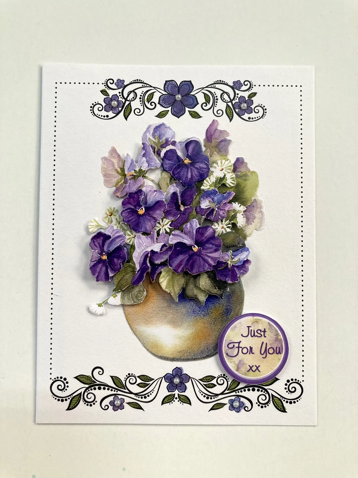 2. Remove pansy layers 2-6 from the background and use foam tape to construct the decoupage design. Use 2-sided tape to attach the design centered on the card front. Foam tape the “just for you” die-cut at the lower right and place pearls in the six largest inked flowers.