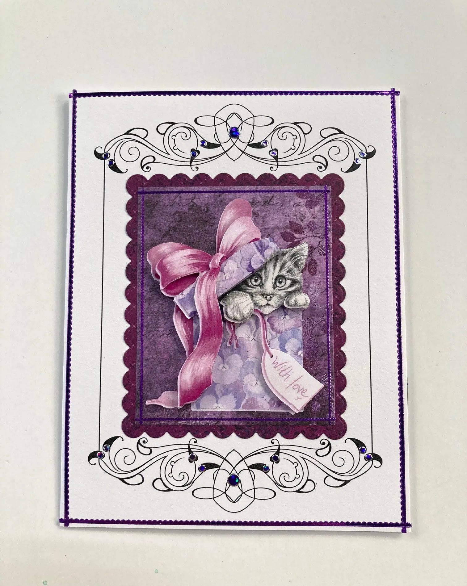 1. For the card front: Place thin line Dazzles™ near the edges of the card front, trimming the excess. Place jewel Dazzles™ on the flourishes as shown. Remove the cat gift layers from the background and use foam tape to construct the decoupage design.